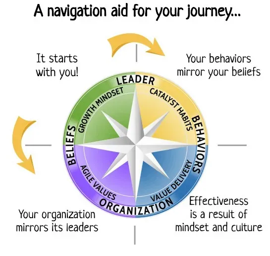 罗盘的上半部分是敏捷领导力应始于领导者的成长型思维模式,领导者的思维是对其行为和习惯的映射。
