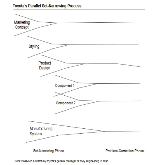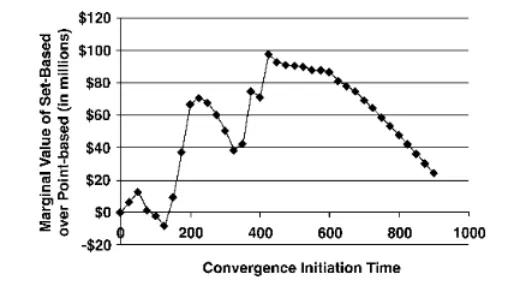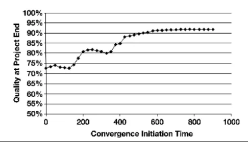 关键在于何时开始向最终的解决方案汇集。Ford和Sobek运用实物期权模型模拟了丰田的开发过程,并对一个为期900天的项目进行了100次模拟(“通过模拟第二个丰田悖论将实物期权应用于新产品开发”,发表于IEEE工程管理汇刊52 [FS05])。